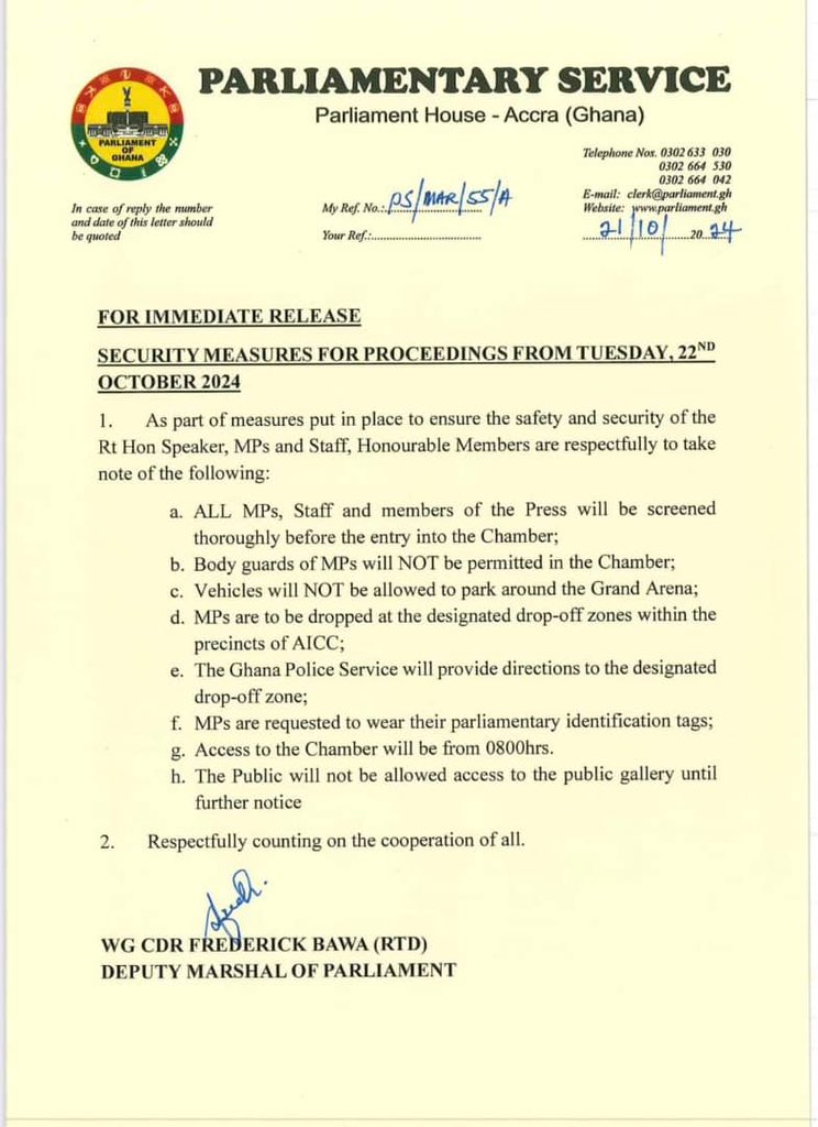 A press release signed by Wing Commander Frederick Bawa (Rtd.), Deputy Marshal of Parliament, outlined the steps to safeguard the Speaker, Members of Parliament (MPs), and parliamentary staff during this period.