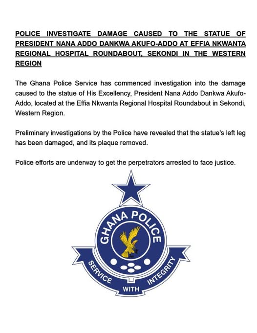 Police in the Western Region have launched an investigation into the damage caused to a statue of President Nana Addo Dankwa Akufo-Addo at the Effia Nkwanta Regional Hospital Roundabout in Sekondi.