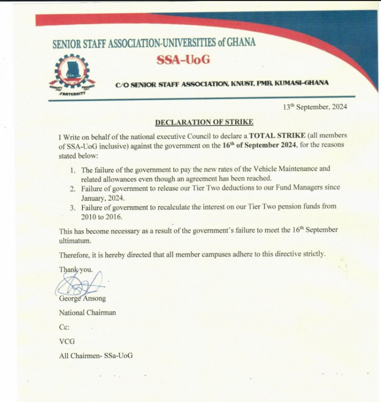 The Senior Staff Association of Universities of Ghana (SSA-UoG) has declared a national strike starting on Monday, September 16, 2024, due to the government’s failure to address their demands for improved working conditions.