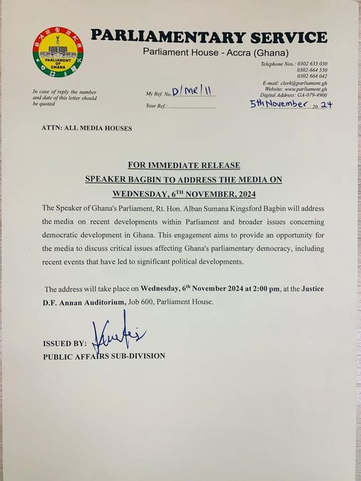 The Speaker of Parliament, Alban Bagbin, is set to brief the media on Wednesday, November 6, on recent developments within Parliament and issues related to Ghana’s democratic governance.