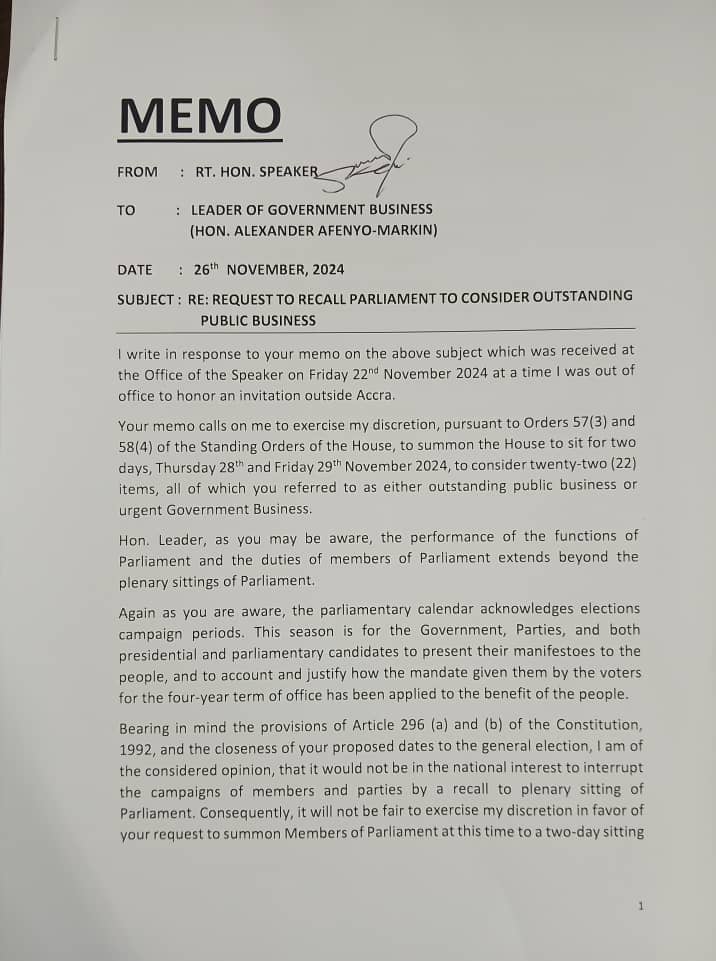 In a memo dated November 26, 2024, Mr. Bagbin addressed the Majority Leader’s request for a two-day sitting on November 28 and 29 to deliberate on 22 items described as urgent or outstanding government business.