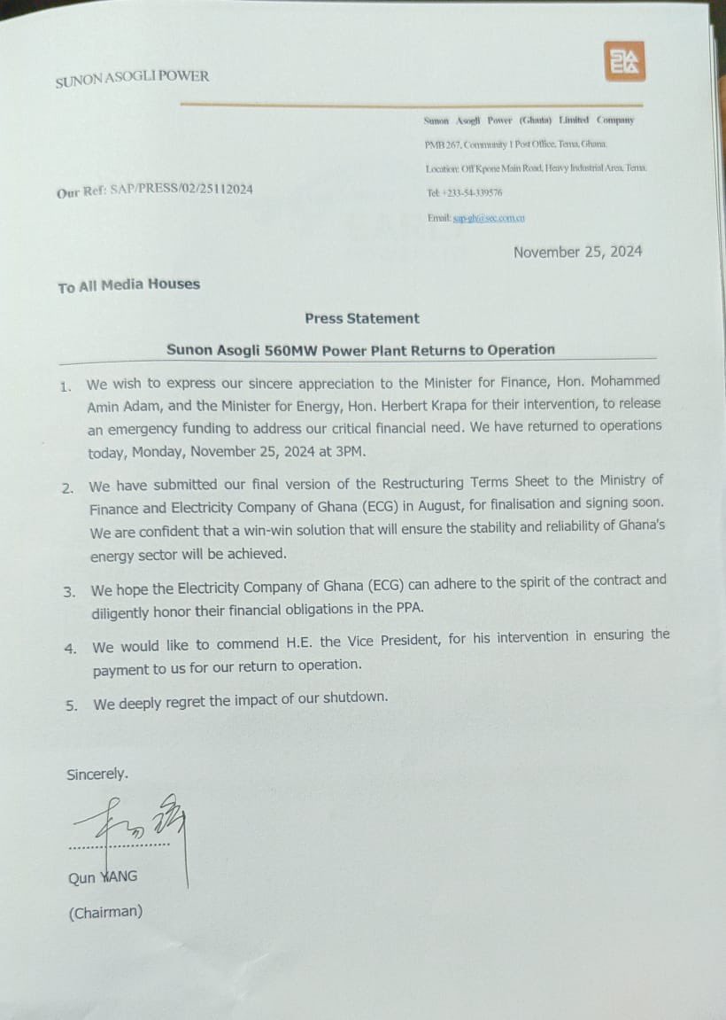 In a statement released on Monday, Sunon Asogli expressed optimism about resolving the crisis. “We have submitted our final version of the Restructuring Terms Sheet to the Ministry of Finance and ECG in August for finalization and signing soon. We are confident that a win-win solution ensuring the stability and reliability of Ghana’s energy will be achieved.”
