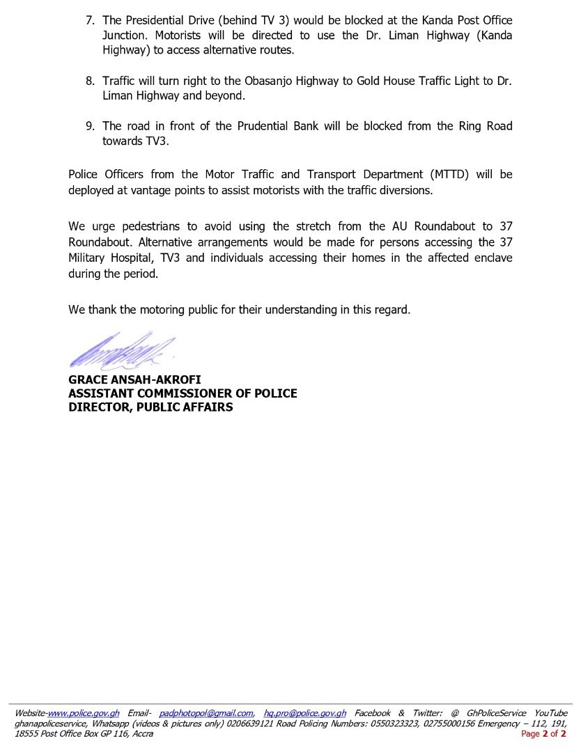 Furthermore, the Presidential Drive behind TV3 will be closed at the Kanda Post Office Junction, and roadblocks will be implemented in front of Prudential Bank, affecting traffic from Ring Road towards TV3.