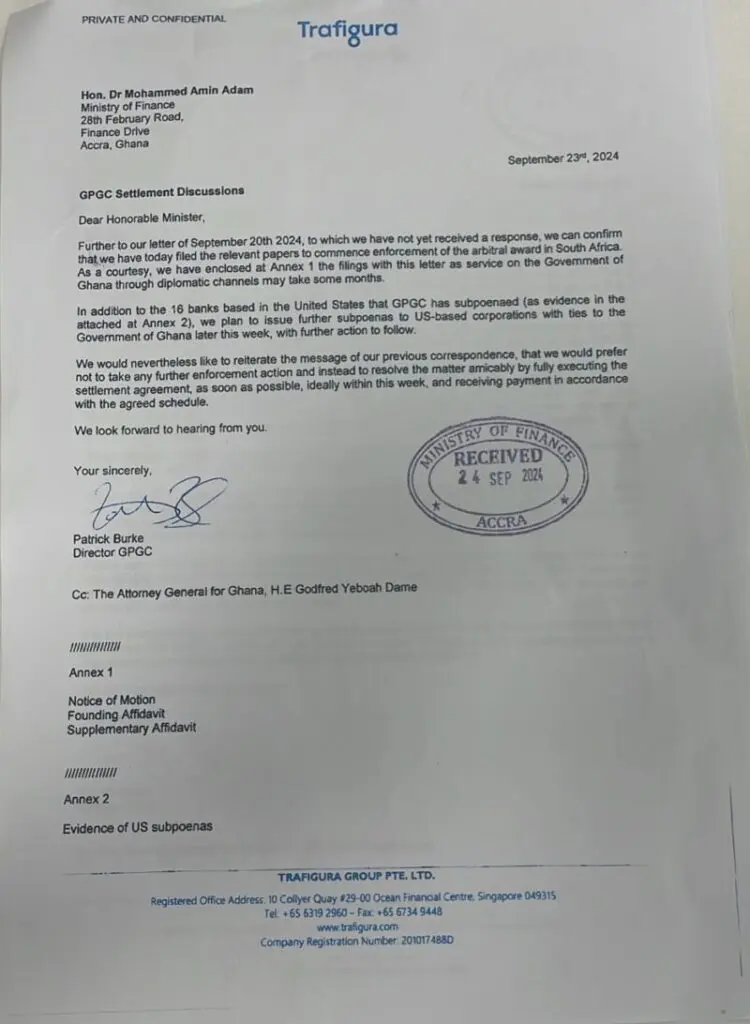 In a letter addressed to Finance Minister Dr. Mohammed Amin Adam, Trafigura outlined the steps it has taken to enforce the arbitration ruling in its favour. The letter, dated September 23, 2024, reveals that Trafigura has filed the necessary legal papers to begin enforcement proceedings in South Africa.