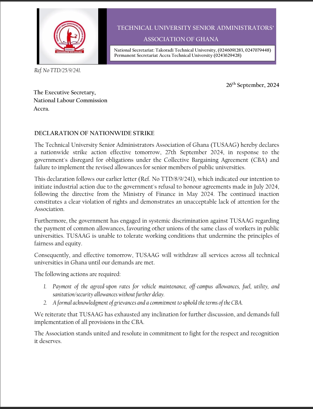 The Technical University Senior Administrators Association of Ghana (TUSAAG) has announced a nationwide strike action, effective 27th September 2024, in protest of the government’s failure to meet its obligations under the Collective Bargaining Agreement (CBA) and implement revised allowances for senior members of public universities.