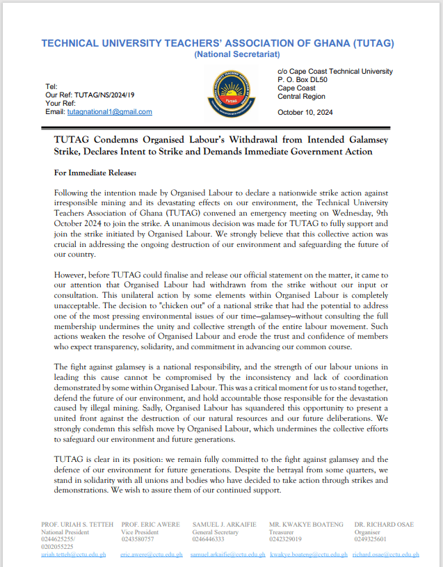 Following an emergency meeting on October 9, 2024, TUTAG expressed disappointment at Organised Labour’s unilateral withdrawal, describing it as a setback in the fight against galamsey. TUTAG accused some elements within Organised Labour of undermining the collective strength of the movement.