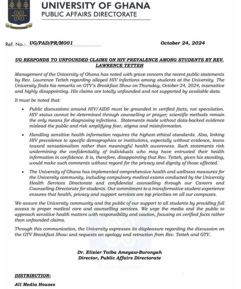 The University of Ghana has expressed serious concern over recent remarks made by Rev. Lawrence Tetteh on GTV’s *Breakfast Show* on October 24, 2024, where he alleged high HIV prevalence among the university’s students.