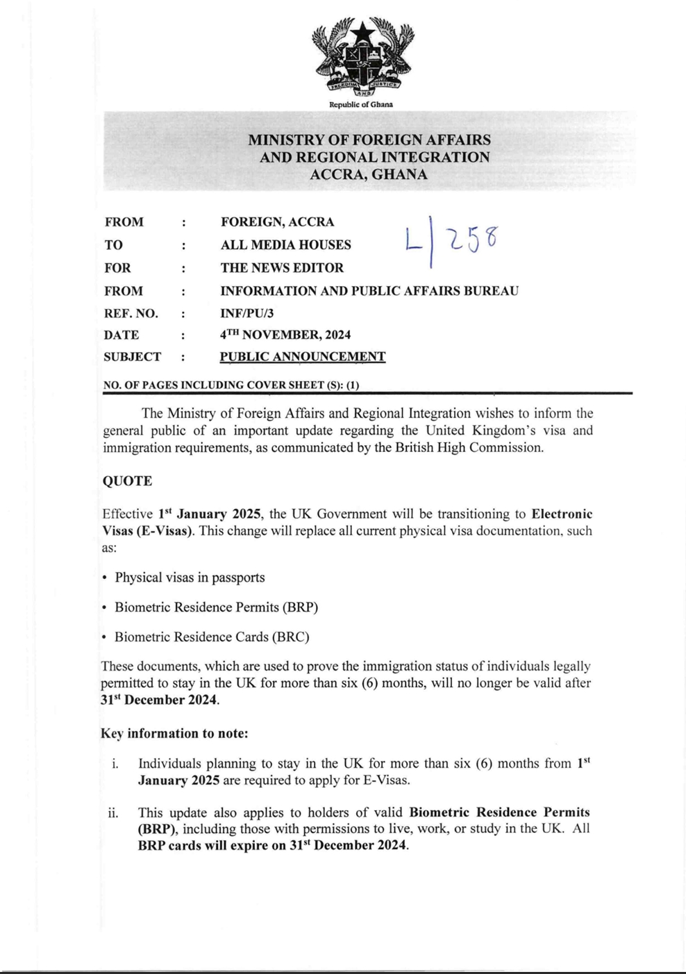 The Ministry of Foreign Affairs and Regional Integration has announced a major change in the United Kingdom’s visa and immigration policies. Beginning January 1, 2025, the UK government will fully transition to Electronic Visas (E-Visas), phasing out all physical visa documentation, including Biometric Residence Permits (BRP) and Biometric Residence Cards (BRC).