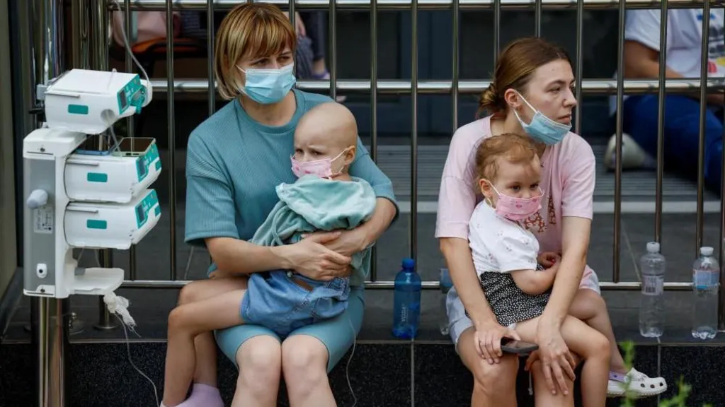 Pictures from the scene of the blast at the Kyiv hospital – which specialises in cancer treatment and organ transplants – showed children hooked up to IV drips sitting outside the damaged facility awaiting evacuation.