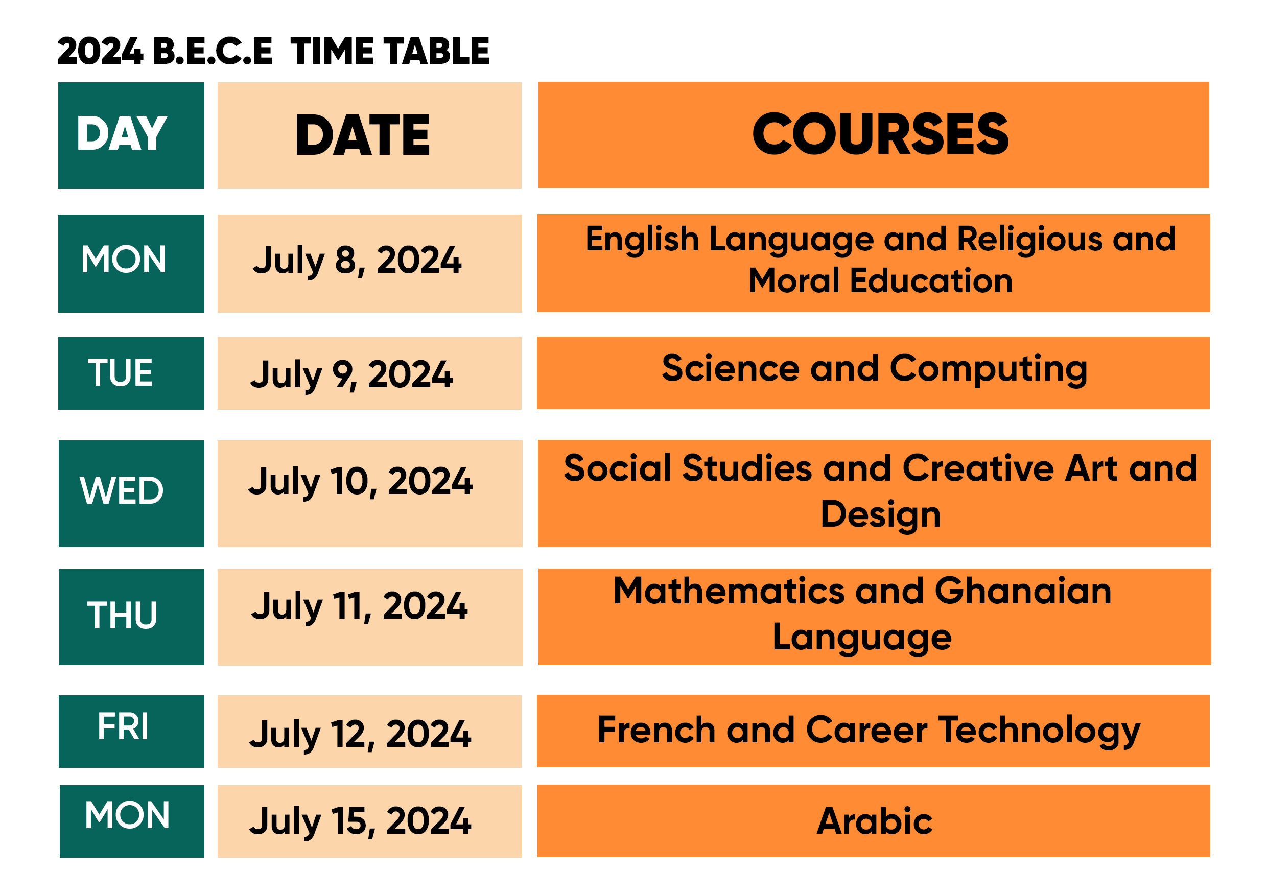 BELOW IS THE 2024 BECE TIMETABLE