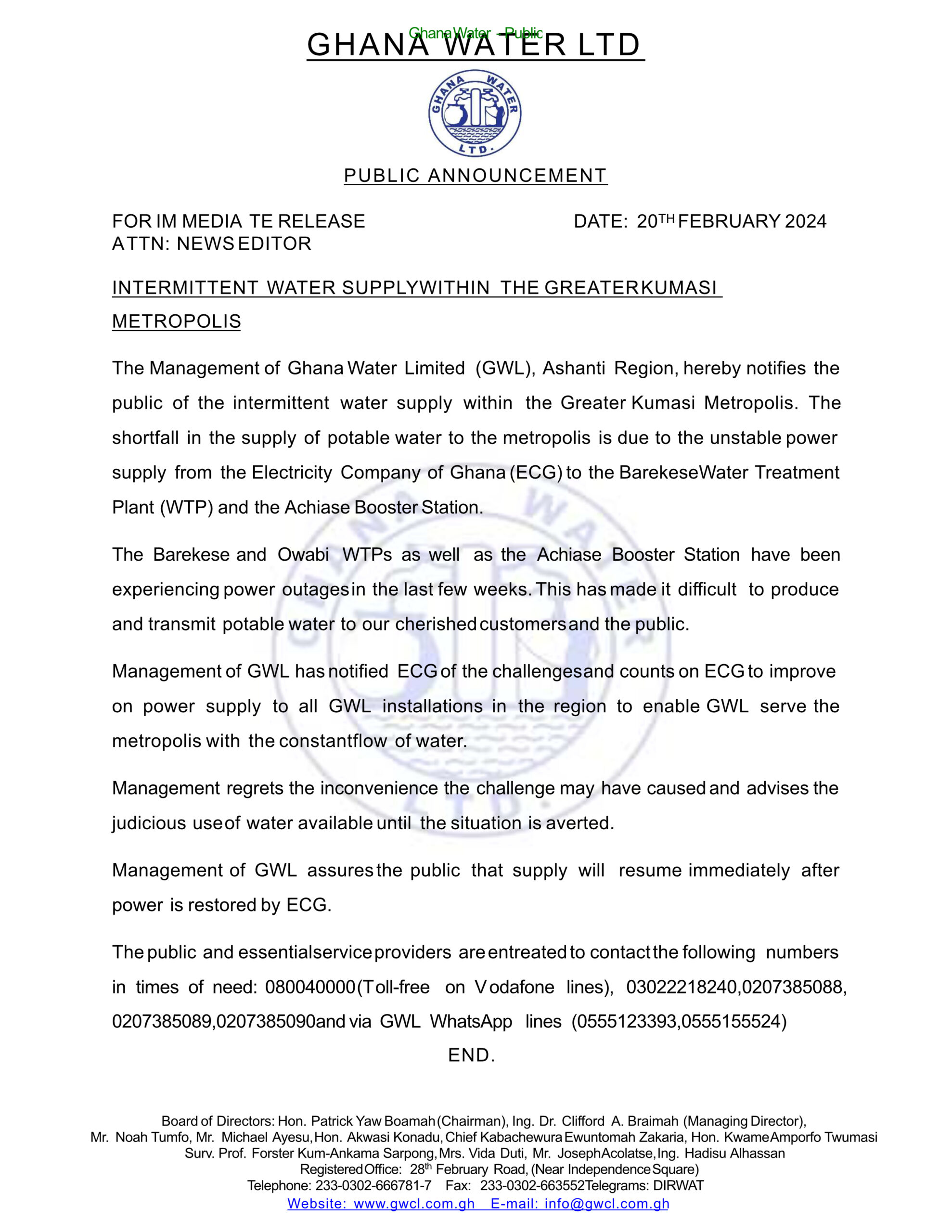 Ghana Water Company Limited (GWCL) in the Ashanti Region has issued a public announcement, highlighting the challenges stemming from power cuts at the Barekese Water Treatment Plant (WTP) and the Achiase Booster Station.